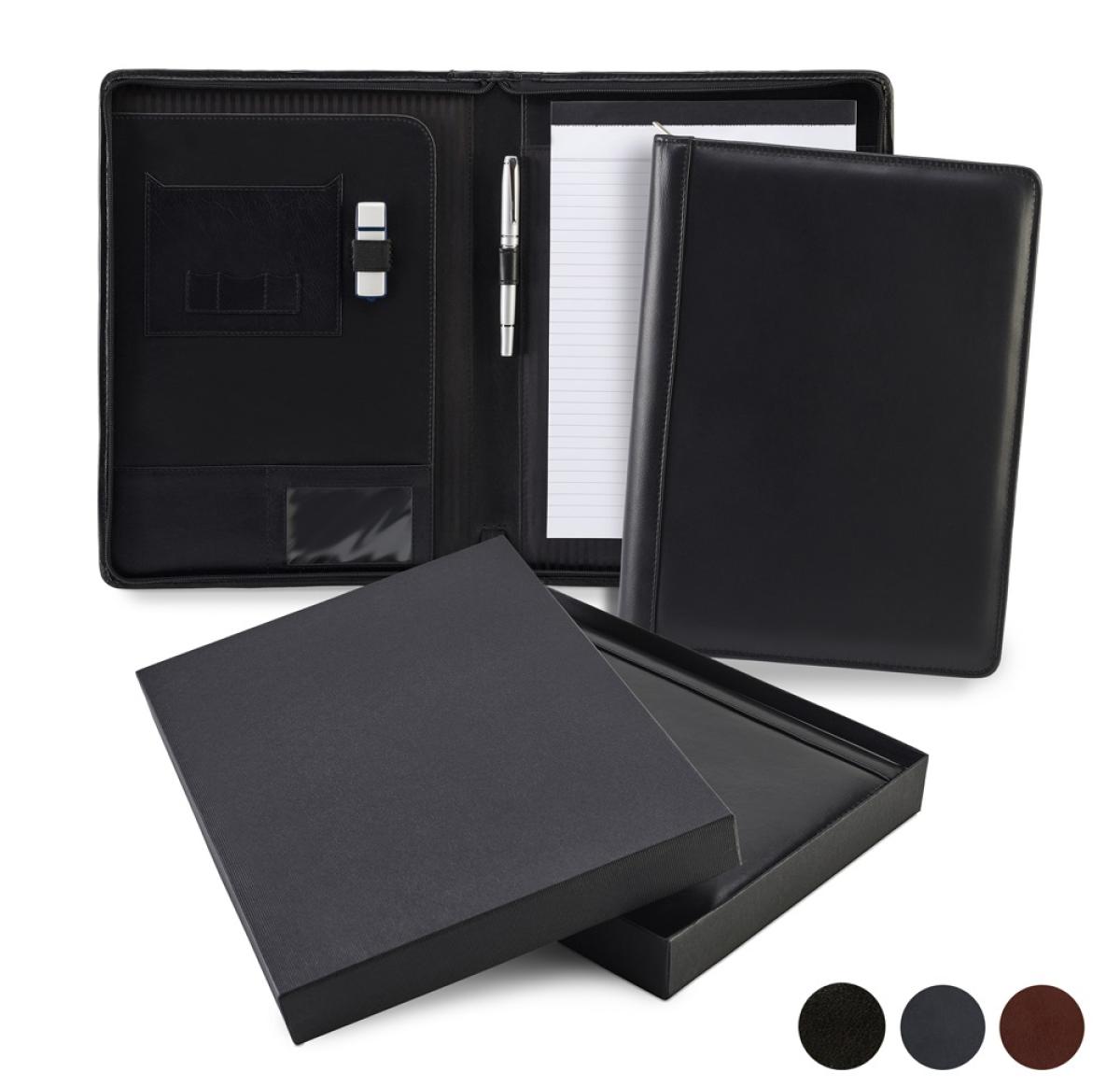Accent Sandringham Nappa Leather Zipped A4 Conference Pad Holder. Available with matching or contrasting stitching or coloured lining, for a bespoke look. Ideal for embossed personalisation. Product features include Genuine Nappa Leather, Interior Pocket for notes or brochures, Pen loop, USB flash stick loop, CD pocket, Business card pocket, SIM Card Pockets, Fitted lined pad, Supplied in a presentation box which can also be branded