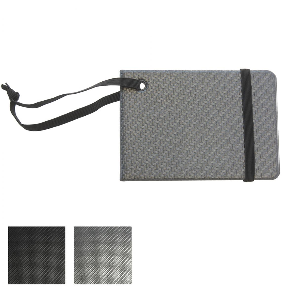 Notebook Style Luggage Tag with Elastic Retainer, finished in a contemporary textured Carbon Fibre effect in a choice of black or gun metal. This material is ideal for embossing and although it can be printed the texture will show through. Product features include Quality die folded edges, elastic strap in a choice of co ordinatin or contrasting colours, printed interior for personal details which can be customised from 250 pcs.