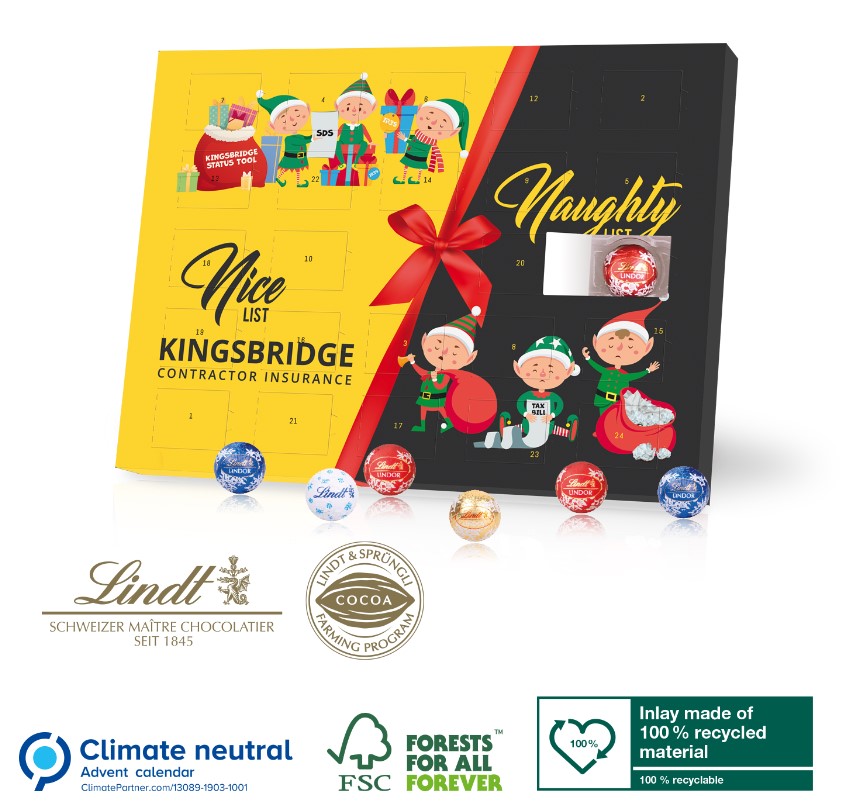 Calendars come stamped with the following sustainable stamps: Climate neutral, FSC certified, 100% recycled and recyclable and Lindt cocoa farming project.