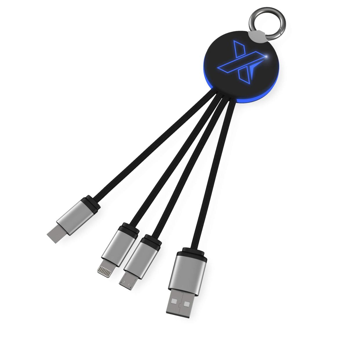 C16 ring light-up cable. Light-up logo charging cable with rubber and metal finish fitted with three connectors (Type C, Android, iPhone). Up to three devices can be charged simultaneously. Length of cables (including plugs): 10 cm. Packaging is made of recycled paper and recycled plastic. Rubber, Aluminium.