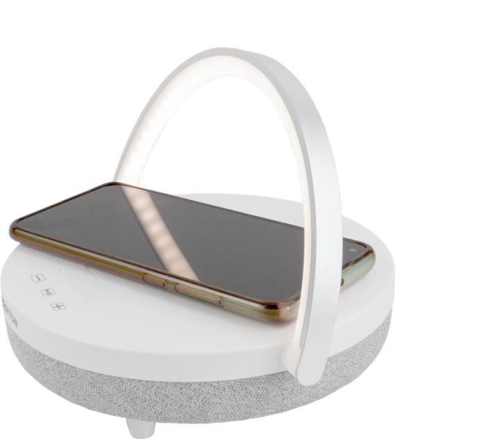 This item has 4 different functions: A wireless Bluetooth® speaker, a wireless charging base, a LED lamp with 3 adjustable brightness levels, and a mobile phone holder. Thanks to its multifunction feature, you can enjoy your favourite music while charging your phone. Delivered with a Type-C charging cable and an auxiliary cable.