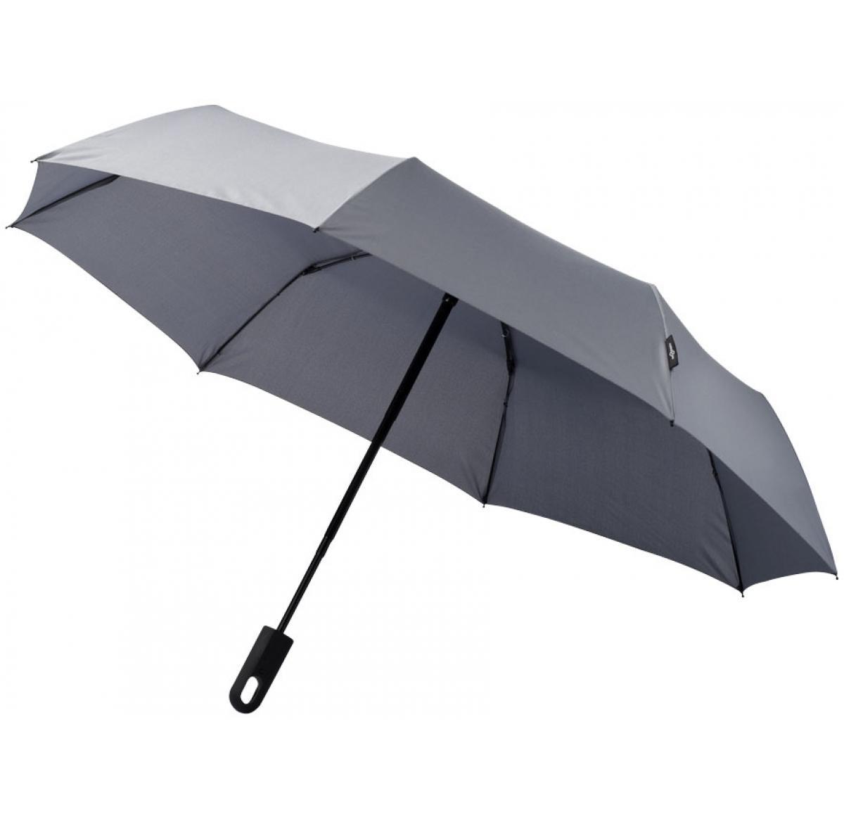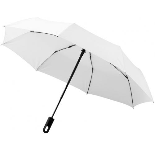 21.5'' Traveler 3-section umbrella. Exclusive design automatic open and close 3-section umbrella. Metal black shaft, fiberglass ribs and rubber coated plastic handle. Supplied with matching canopy colour pouch. Folds up to 31cm. Pongee polyester.