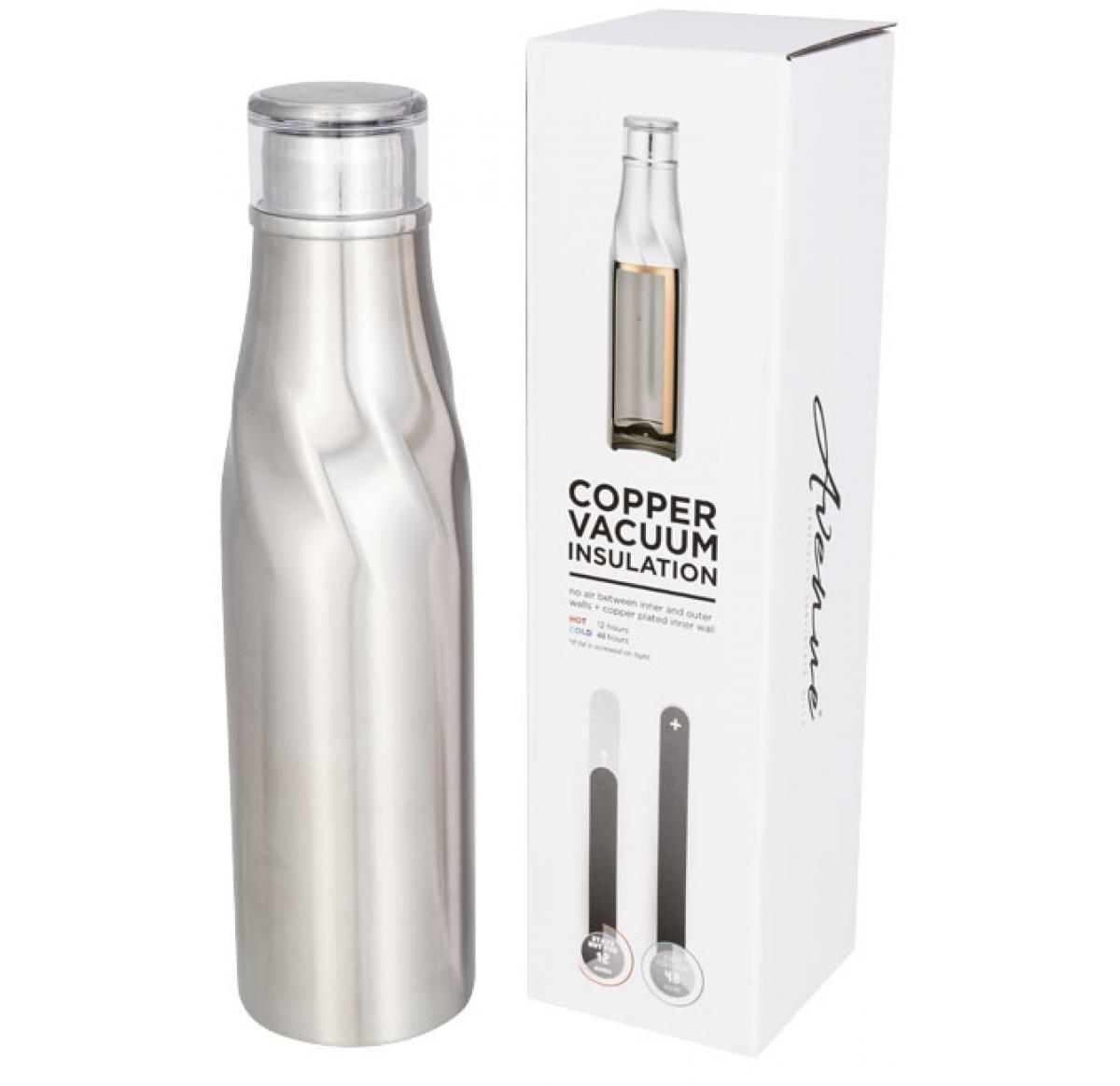 Hugo auto-seal copper vacuum insulated bottle. Design features auto-sealing method for easy opening and a more comfortable drinking experience. Wide opening for comfortable filling and pouring. Durable, double-wall stainless steel vacuum construction with copper insulation, which allows your beverage to stay hot for 12 hours and cold for 48 hours with the auto-seal, spill resistant lid. Volume capacity is 650ml. Presented in an Avenue gift box. Stainless steel.
