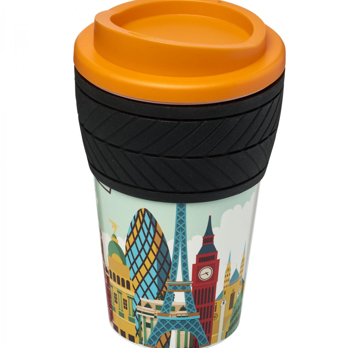 Brite-Americano® tyre 350 ml insulated tumbler. Double-wall insulated tumbler with twist-on lid and tyre design silicone grip. Tumbler features a full colour wraparound design moulded to the product, making it long-lasting and durable. EN12875-1 compl