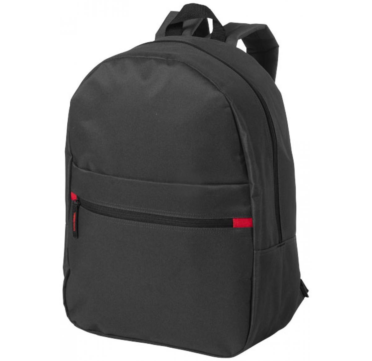 Vancouver Backpack. Rucksack with red details, zipper main compartment and front zipper pocket. Adjustable padded shoulder straps and reinforced top carry handle. 600D polyester.