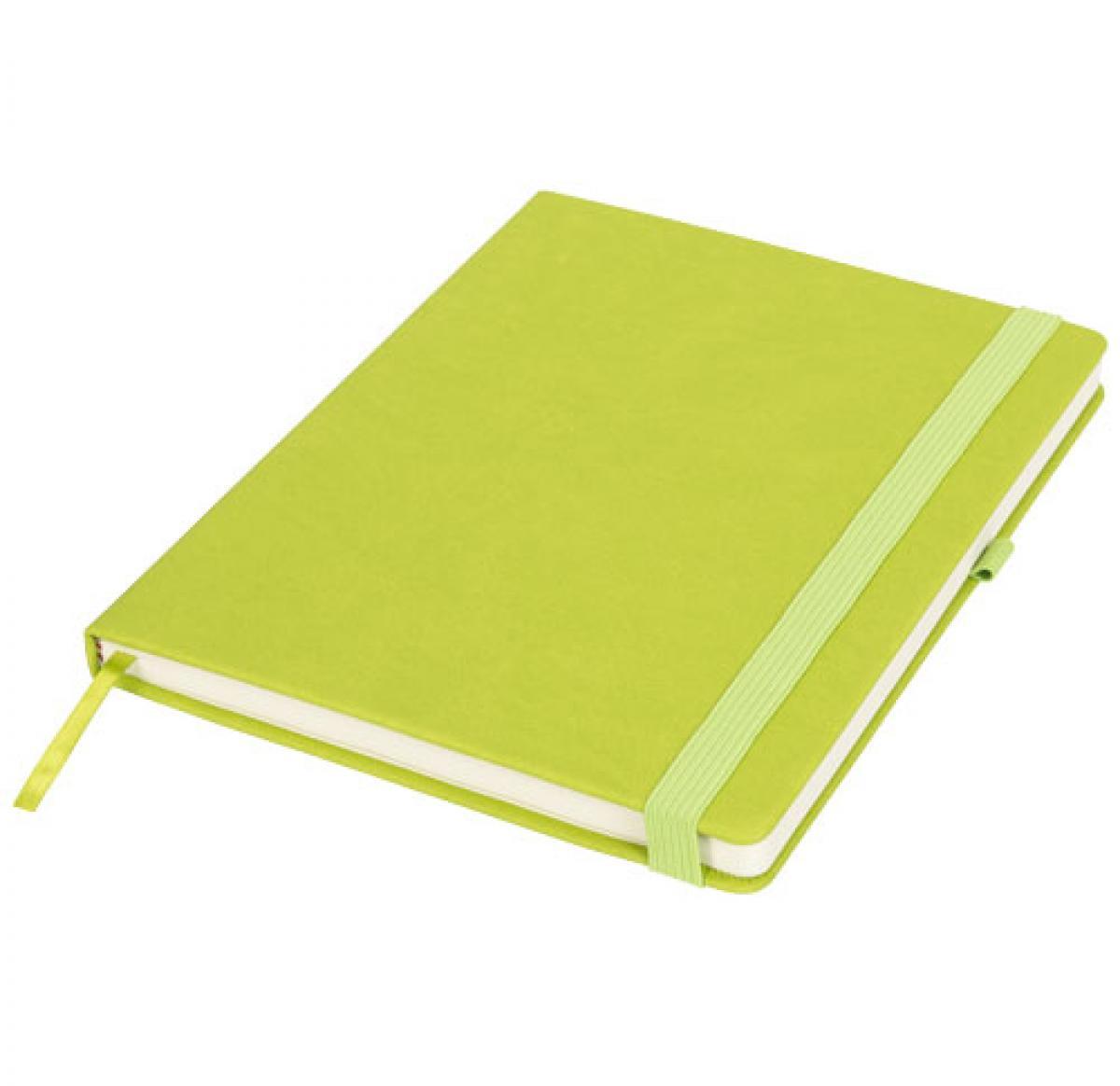 Rivista large notebook. The Rivista Notebook range has a stylish modern design with a high quality, tactile cover, ideal for adding your company logo and details. It?s available in a selection of contemporary colours. Features include an elastic closure, ribbon page marker, pen loop and storage pocket to the inside back cover. Includes 128 sheets (70g/m2) cream lined paper. PU Plastic.