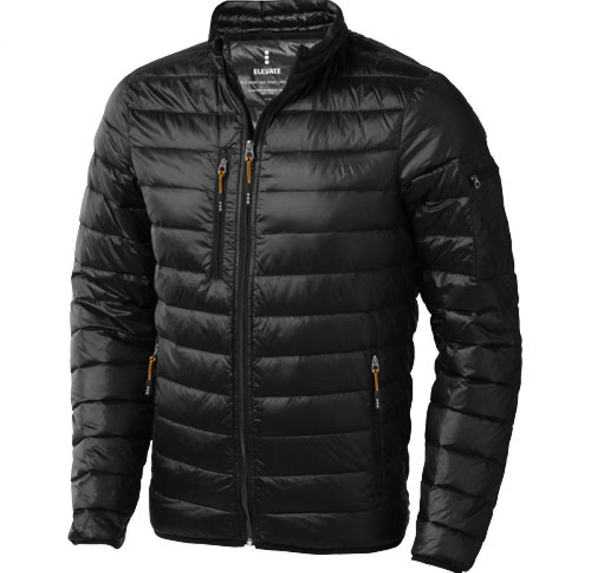 Scotia light down jacket. Downproof pressed fabric.Inner stormflap with chinguard.Sleeve pocket with zipper.Chest pocket with zipper closure.Hand pockets with zippers.Elasticated binding.Centre front contrast coil zipper.Hanger loop.Heat transfer main label for tagless comfort. Woven of 100% Nylon with dull cire water repellent coating, 20D. 90% Down and 10% Feathers. 115 g/m². 115 g/m².