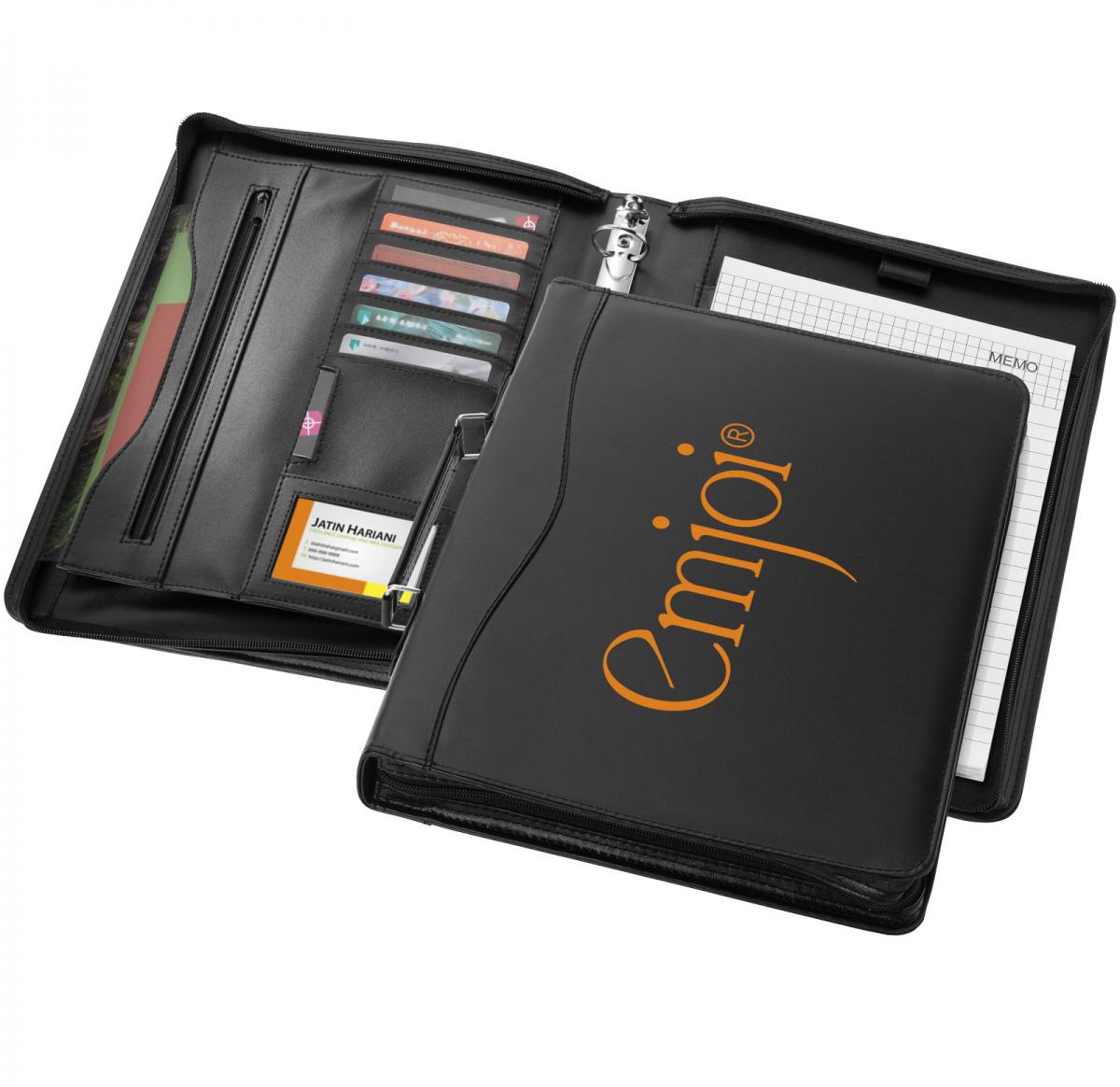 Ebony A4 briefcase portfolio. Portfolio with handle, zipper closure, ring binder, zipper pocket and document compartments. Includes 20 pages lined notepad. Pen and accessoires not included. Imitation leather.