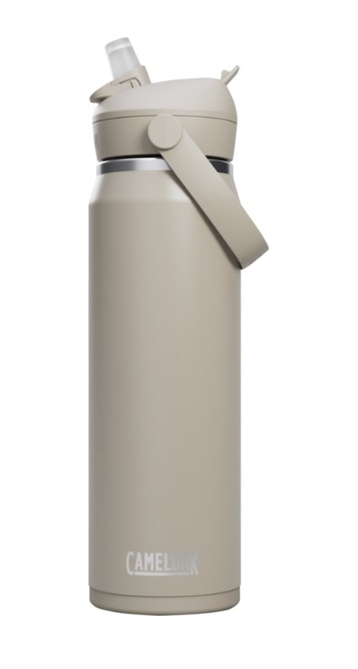 The Camelbak® Thrive Flip VSS (vacuum insulated stainless steel) water bottle is designed to support all-day hydration. It comes with and integrated bumper to protect against dents and to ensure a secure grip on nearly any surface. A strong and durable full powder coat finish keeps drinks tasting great, while the double-wall vacuum insulation keeps them hot or cold for hours. Other features include a straw and a EasyFlow valve, 100% leakproof cap, a dust cover for protection, and a soft pivoting handle for easy carrying. The design fits in most cup holders, making it convenient for travel or day hikes. The entire bottle is dishwasher safe for quick and easy cleaning. Volume capacity: 740 ml. Stainless Steel.