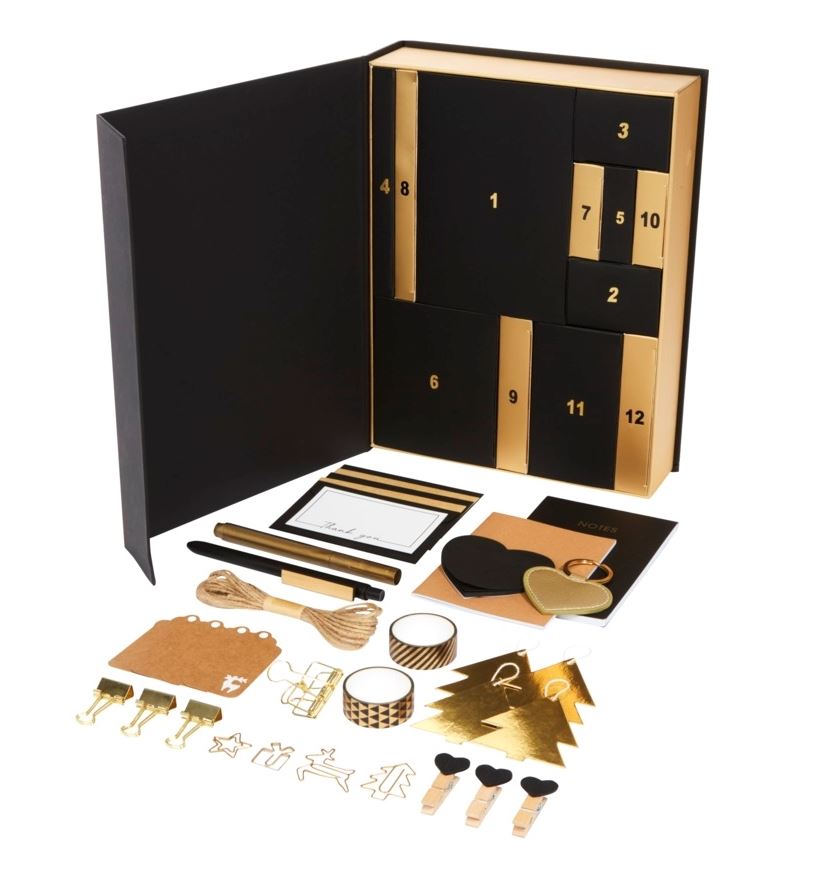 This gift box contains 12 items of stationery varying from a mini notebook to a writing card set, name tags, paper clips, a ballpoint pen, gold marker, washi tape and more. Each day offers a different piece of stationery to be revealed and enjoyed throughout the year to come. Cardboard paper.