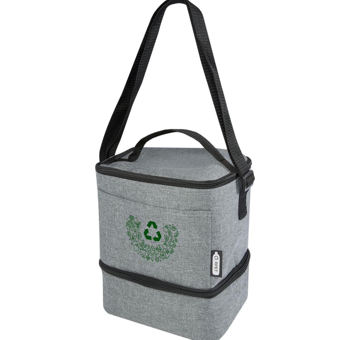 The Tundra recycled lunch cooler bag provides ample storage for all your lunch time goodies. Featuring a top insulated zippered compartment, and a bottom insulated zippered compartment. The bottom compartment is perfect for your bento box, and the front slash pocket is ideal for storing your face mask or other small items. The cooler PEVA lining and exterior is made from recycled PET plastic. 600D of Recycled Polyester.