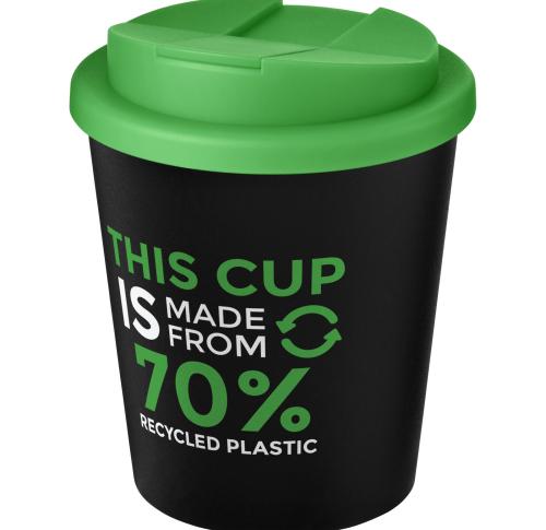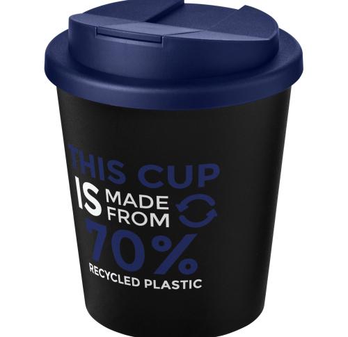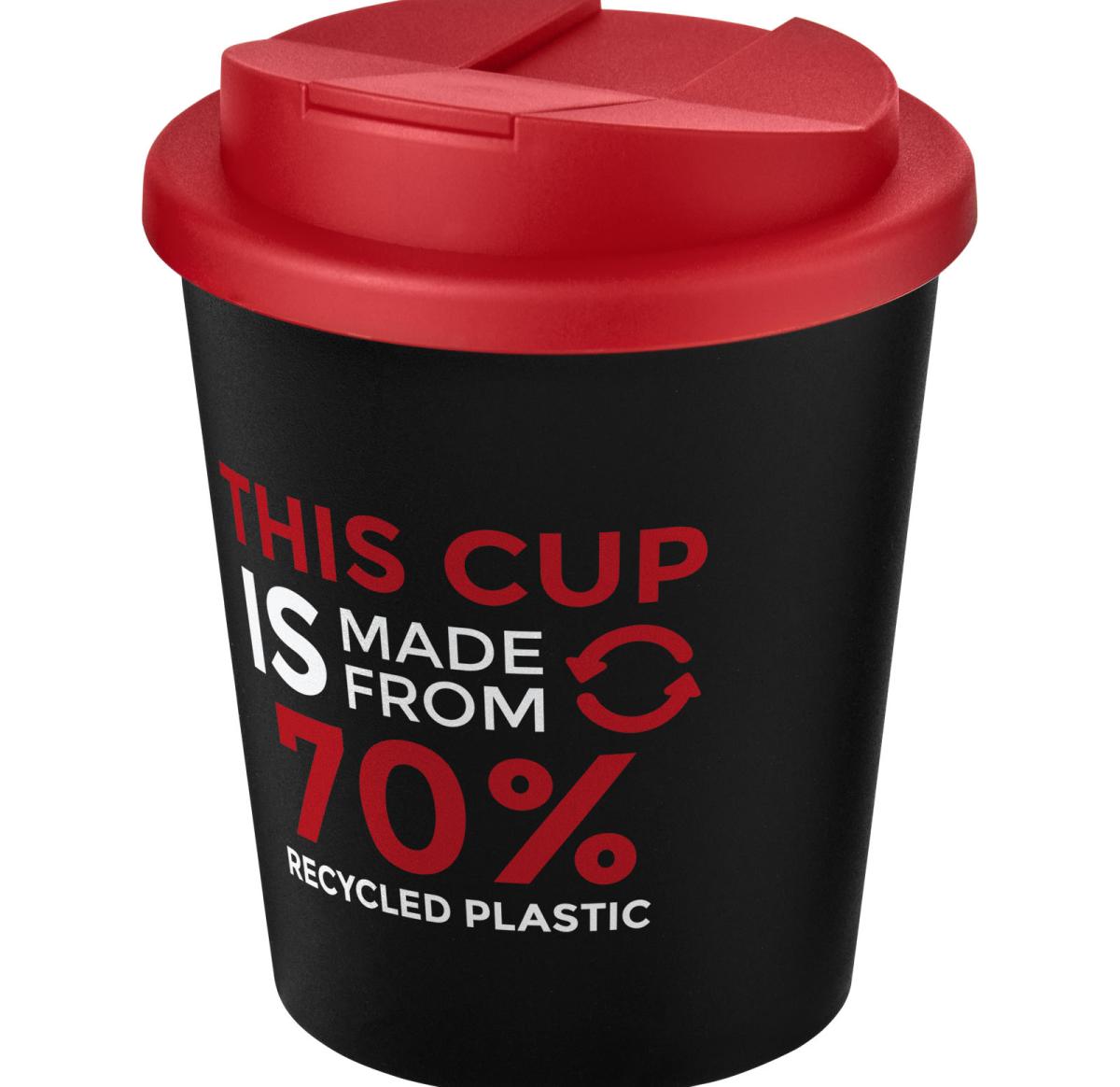 Double-wall insulated tumbler with a secure twist-on spill-proof lid. The lid clips closed to better prevent spillages, and is manufactured without silicone for a fully recyclable mug. The tumbler is made of 100% recycled PP plastic and the lid is made of food grade PP plastic. Volume capacity is 250 ml. Supplied in a home compostable bag. Made in the UK. Recycled PP Plastic, PP Plastic.
