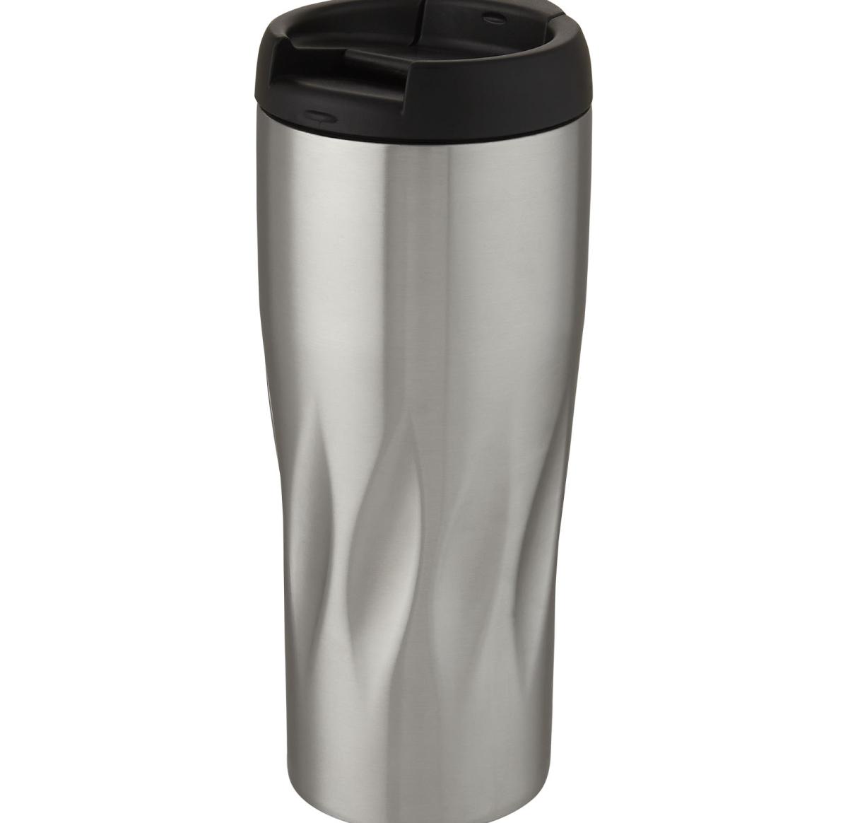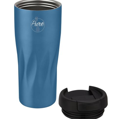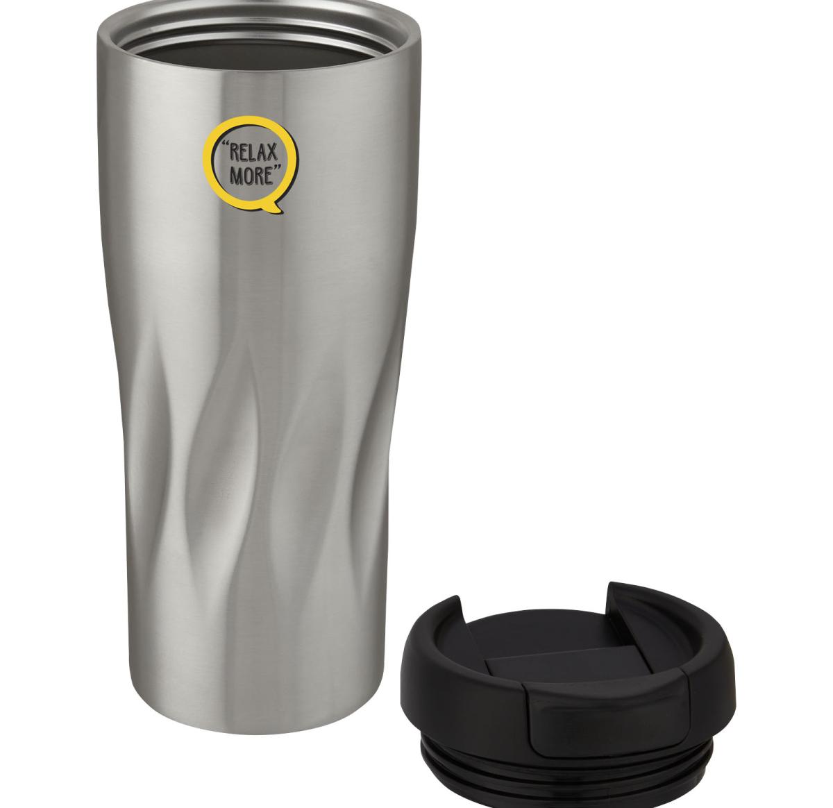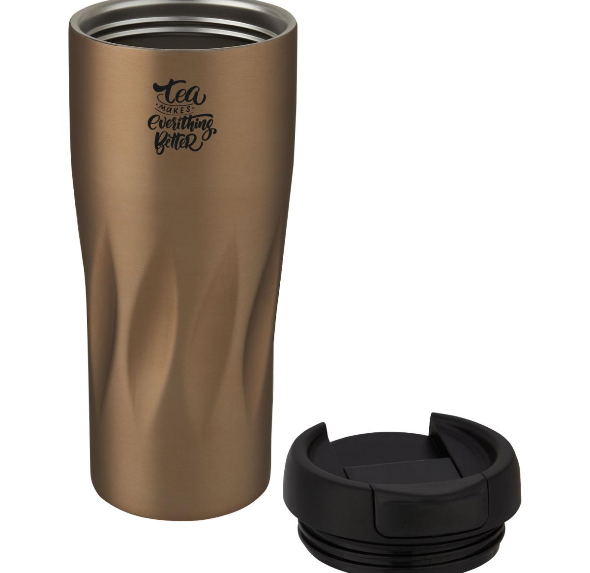 Double-walled copper vacuum insulated tumbler with screw-on leakproof lid featuring a wavy geometric design. The insulated 18/8 stainless steel keeps drinks hot or cold for several hours. BPA-free and tested and approved under German Food Safe Legislation (LFGB), and tested for phthalates content according to REACH regulations. Volume capacity is 450 ml. Hand wash recommended. Presented in a recycled cardboard gift box.