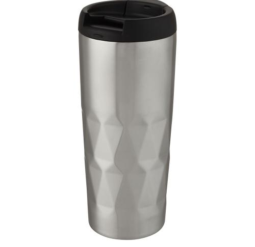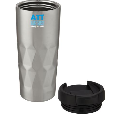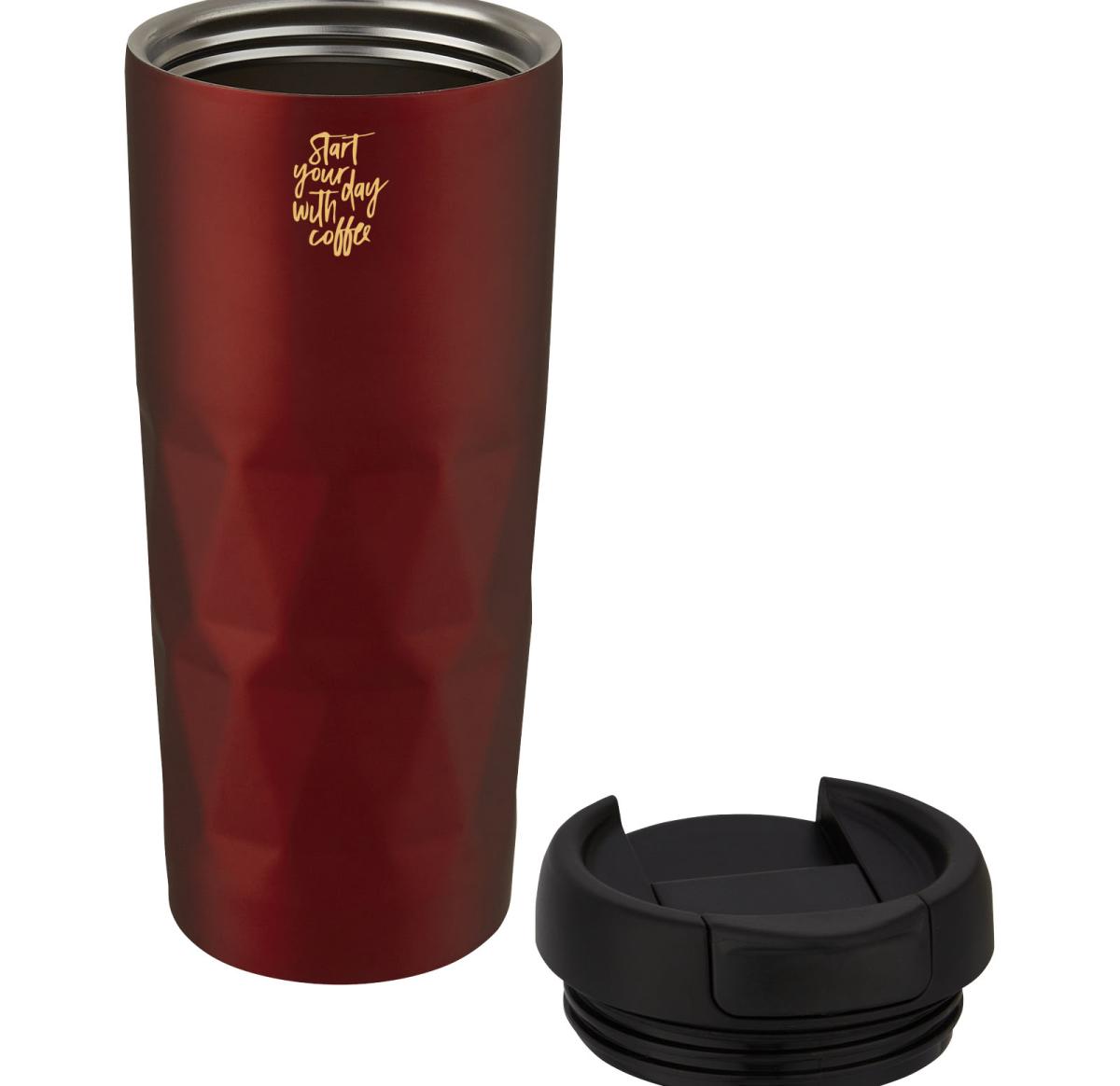 Double-walled copper vacuum insulated tumbler with screw-on leakproof lid featuring an intricate geometric design. The insulated 18/8 stainless steel keeps drinks hot or cold for several hours. BPA-free and tested and approved under German Food Safe Legislation (LFGB), and tested for phthalates content according to REACH regulations. Volume capacity is 450 ml. Hand wash recommended. Presented in a recycled cardboard gift box.