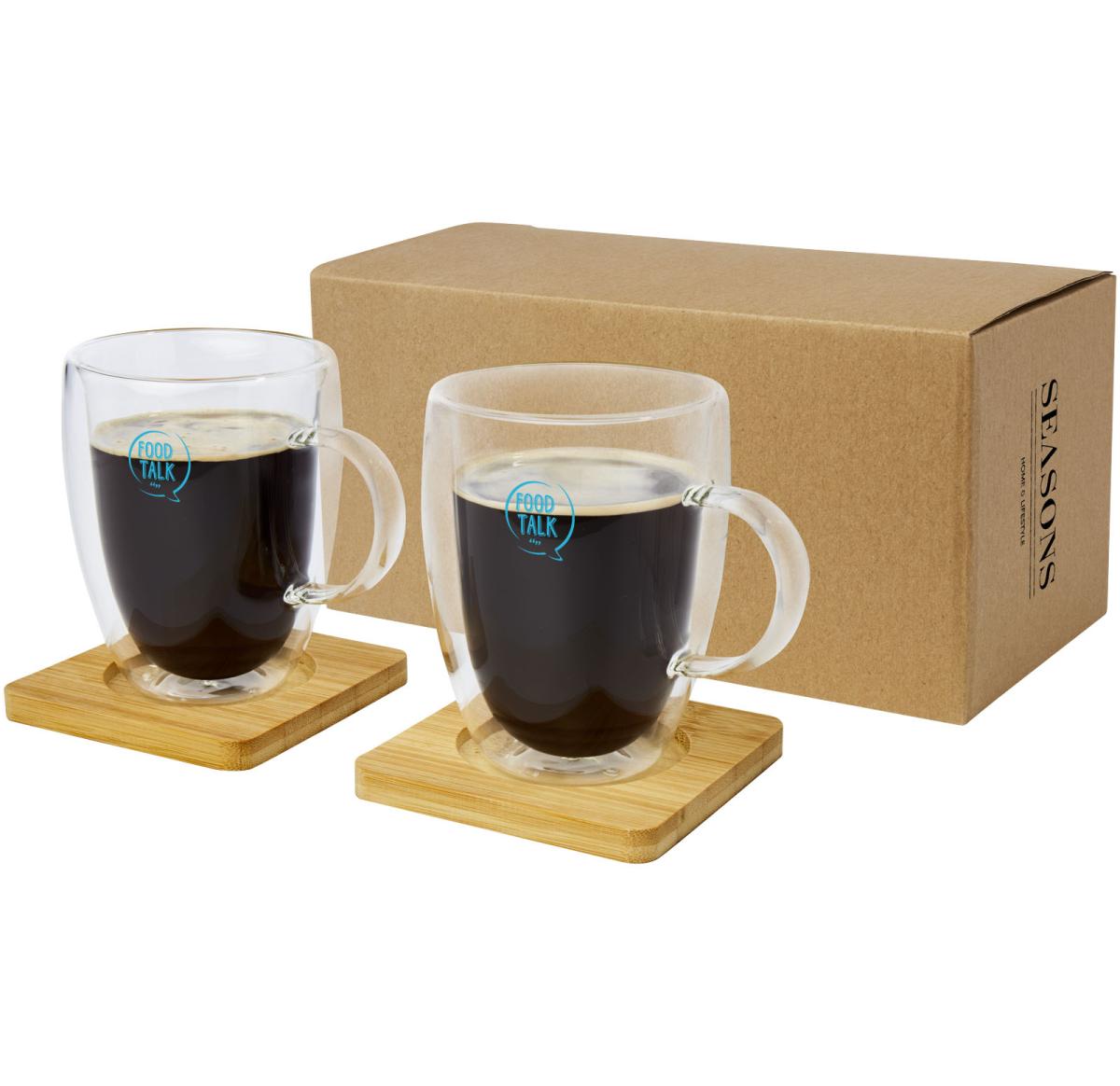 A set of 2 double-wall thermal glasses with bamboo coaster. The bamboo comes from sustainable, environmentally, and socially responsible sources. Thanks to the double borosilicate glass, the temperature of the drink is retained for a long time. Volume capacity is 350 ml. Coaster size: 10 x 10 x 1 cm.