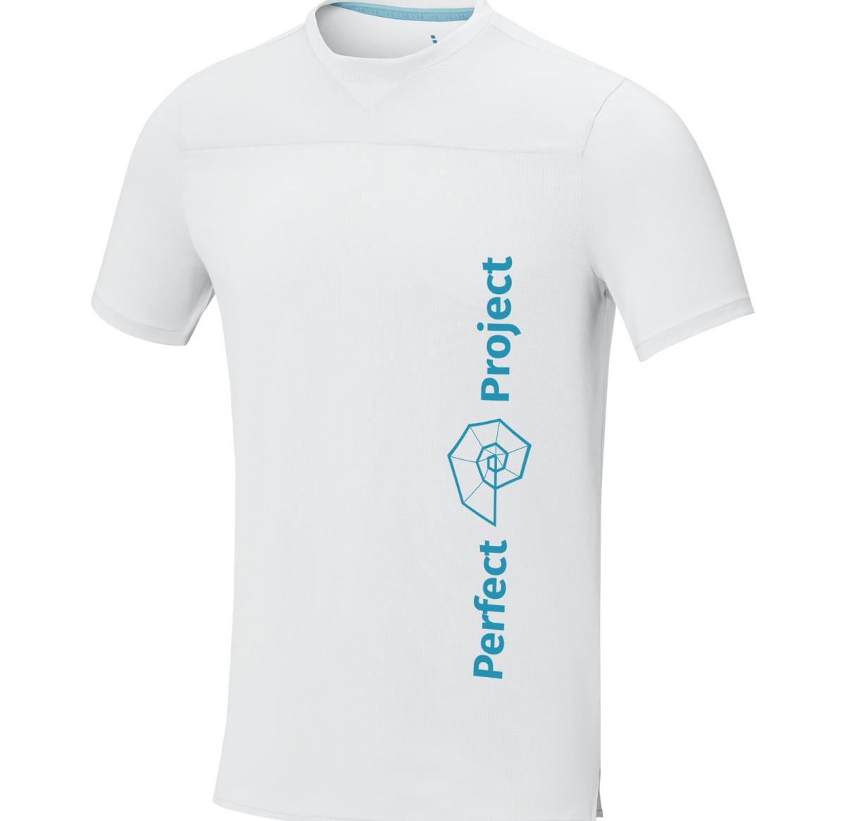 Sustainable promotional apparel. Crew neck with V-detail. Self-fabric collar. Side slits. Bi-coloured branded shoulder to shoulder tape. Heat transfer main label for tagless comfort.