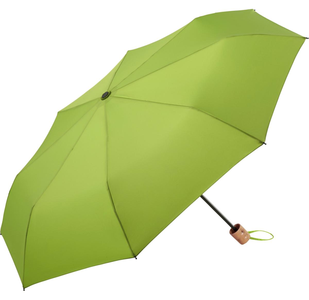 Sustainable manual opening mini umbrella with shopping bag Easy to handle thanks to sliding safety runner, high-quality windproof system for maximum frame flexibility in stormy conditions, polyester Pongee waterSAVE® cover material made of recycled plastics and dyed using a water-saving process, wooden handle with promotional labelling option, sleeve with zipper can be used as a reusable shopping bag with compartment for the umbrella