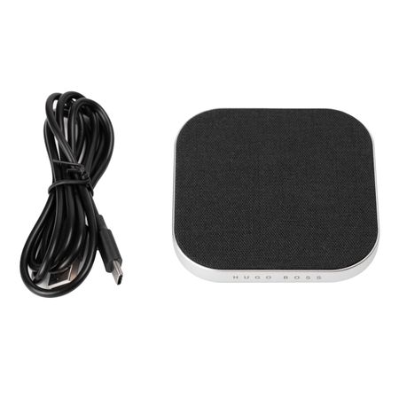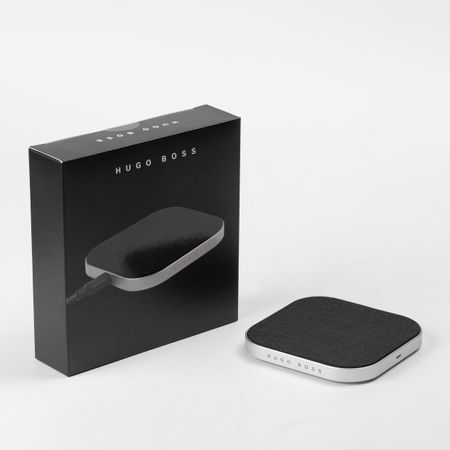 This Hugo Boss wireless charger is not only very practical, but also an eye-catcher on your desk. From now on, you won't need a cable to charge your smartphone. Simply place the device on top and, voilà, it starts charging by itself. Compatible to all Q1 devices. This square design charger has an aluminium finishing with elegant round corners and a subtle Hugo Boss logo. The charging pad is made of fabric. The compact size 84 x 84 x 9.5 mm makes it easy to take the charger with you. This item comes in a luxurious Hugo Boss gift box including 1M Type-C cable and user manual. Available in dark chrome and chrome (silver).