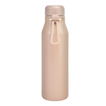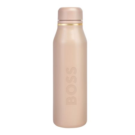 The BOSS bottle features a smooth, matte surface embossed with an oversized BOSS logo, expressing a warm and trendy signature through a clean, modern silhouette in nude with refined gold trims. The design is completed by a plated Double B logo on the lid in matching metal tones, while carefully coordinated details and a tone-on-tone silicone strap ensure a cohesive and streamlined look. With a 600 ml capacity, the bottle is designed for everyday use and easy portability, carrying both hot and cold drinks throughout the day. The bottle is double-walled, with SS304 inner and SS201 outer material.