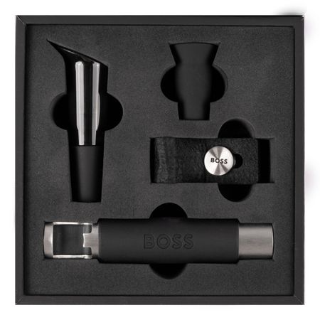 A luxurious gift idea, our new Iconic wine set is crafted from soft rubber and felt on the one hand and highly resistant brushed steel on the other. The beautifully crafted wine set is durable and comes in a luxurious BOSS box. The wine set consists of : - Brushed steel lever corkscrew - Rubber-lined bottle stopper - Felt drip ring - Machine washable wine aerator