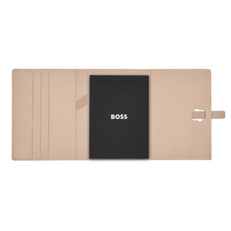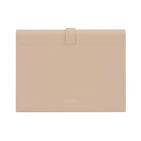 This A5 folder from BOSS combines a soft nude color with light gold-plated accents for a feminine and elegant look. The oversized Double B closing buckle in gold adds a luxurious touch, while the soft textured PU provides a refined finish. The warm, neutral tones of nude are beautifully complemented by the gold details, making it a perfect match with the feminine Arche Double B pen and keyring for an attractive gift set.