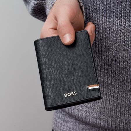 Boss Iconic line is characterized by carefully chosen top-grain textured and an on trend aesthetic. All pieces are skilfully assembled and beautifully finished with crisp chrome signature plates and monogram linings. Another distinctive feature of this iconic version is the tricolored textile flag that adorns all items in this series. This Compact card holder includes : 2 currency compartments 8 card slots 2 side compartments