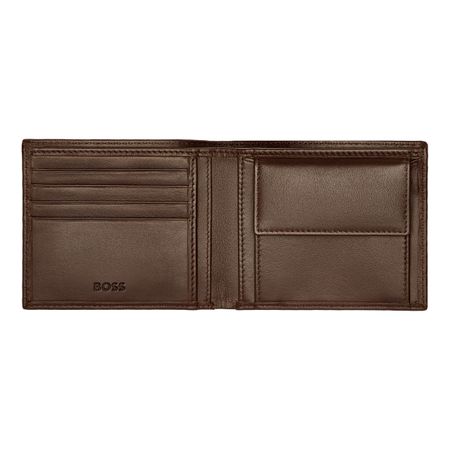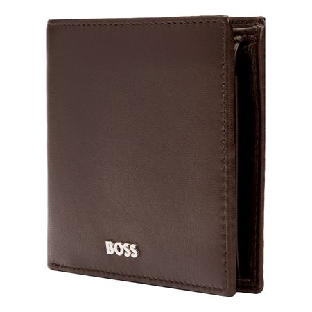 The Boss Classic Smooth line is Boss ultimate minimalist, timeless small leather goods offering, characterized by carefully chosen leathers and understated aesthetics. All pieces are masterfully crafted and signed with crisp chrome Brand plates, along with monogram linings. The designs are available in black and brown. This classic wallet with coin pouch includes : 2 currency compartments 4 card slots 3 side compartments 1 coin pocket