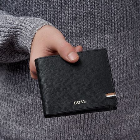 This trifold wallet with a coin pouch is made of carefully chosen, top-grain black textured leather. It is adorned with a luxurious chrome BOSS signature plate and features monogrammed inside lining. Another distinctive feature of this iconic version is the tricolored textile flag that adorns all items in this series The wallet includes: 2 currency compartments 8 card slots 3 side compartments 1 coin slot In line with the BOSS brand DNA, it is simple, functional, elegant, and minimal.