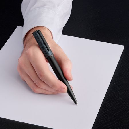 This pen offers an innovative update to the signature â??Archeâ? silhouette, featuring BOSSâ?™s iconic monogram on brushed aluminum. This stylish black and navy color combinaison,combines the understated elegance of matte metal with the brandâ?™s recognizable signature, offering a luxurious writing experience.