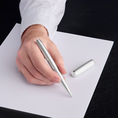The Pace collection is crafted on a dynamic and harmonious frame. This latest addition to the writing instrument series features a sleek matte chevron pattern on the cap, beautifully contrasted by the clean, metal-plated lower barrel and an unexpected logo placement. It is a refined piece that captures the essence of subtle luxury.