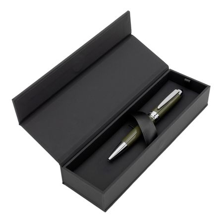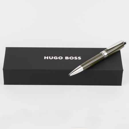 Introducing the HUGO BOSS Ballpoint Pen Icon Kaki/Chromeâ??a perfect blend of sophistication and functionality. Crafted from high-quality brass with a sleek dark green lacquer finish, this pen exudes elegance in every stroke. Weighing just 46 grams, it feels substantial yet comfortable in your hand, making it ideal for both professional and personal use. With a smooth blue ink cartridge and stylish chrome accents, make a statement with every note you take. Elevate your writing experience with this exquisite accessory that suits everyoneâ??men, women, and anyone in-between.