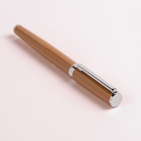 Our iconic Gear silhouette returns with a timeless twist, featuring a simplified logo ring with a glossy lacquer. This new version of gear already feels iconic, and is probably our most commercial item, it features luxurious glossy lacquer on this signature frame. A sophisticated take on a minimalist design, this makes for an instant classic writing instrument, and is available in an array of colors, both neutral such as this camel version, or color block pop options.