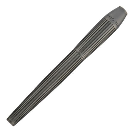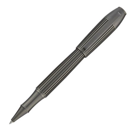 This shape strikes a perfect balance between strength and elegance, featuring a deep, oversized pinstripe pattern. Plated in a luxurious matte gunmetal shade, the piece exudes a minimalistic yet intricate and refined feel. The meticulous craftsmanship and subtle detailing make it feel both precious yet understated. Its design showcases a bold contemporary aesthetic, resulting in a striking writing instrument.