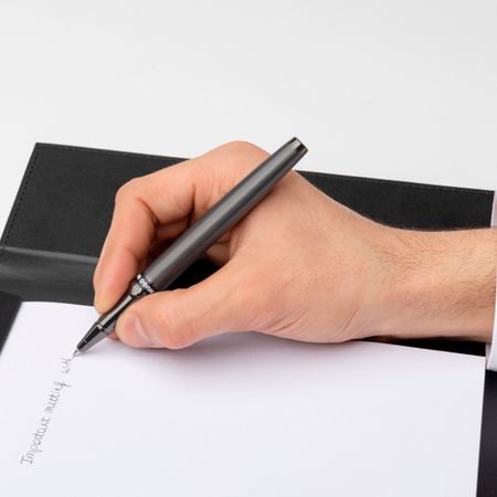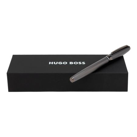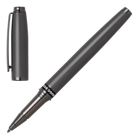 The Stream rollerball pen is a sleek and modern writing instrument designed to provide a balanced writing experience. It features a new silhouette that combines simplicity and modernity. The pen is adorned with an engraved pattern that is plated in a luxurious matte gunmetal finish, providing an elevated haptic sensation. The black and white logo ring adds a touch of playful graphical element to the design. Offered in a luxurious fully recyclable, black packaging.