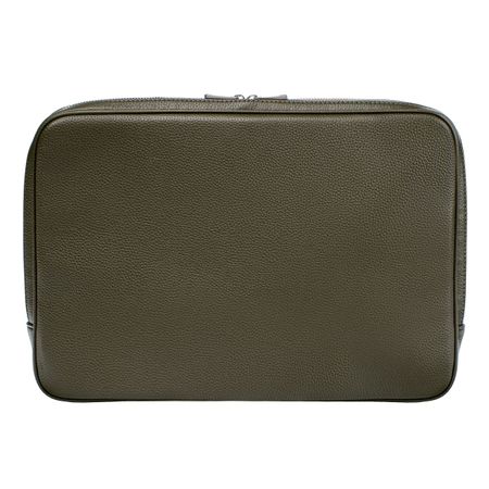The Grained Classic computer sleeve is crafted in a soft leather-like grained texture, accented with a crisp chrome signature plate and matching chrome zippers. Inside, a tone-on-tone monogrammed lining highlights the refined finish. Designed with multiple compartments, it offers exhaustive organization for everything from pens and documents to cables, cards, or a phone. Available in black, navy, khaki, and taupe.