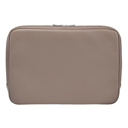 The Grained Classic computer sleeve is crafted in a soft leather-like grained texture, accented with a crisp chrome signature plate and matching chrome zippers. Inside, a tone-on-tone monogrammed lining highlights the refined finish. Designed with multiple compartments, it offers exhaustive organization for everything from pens and documents to cables, cards, or a phone. Available in black, navy, khaki, and taupe.