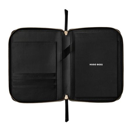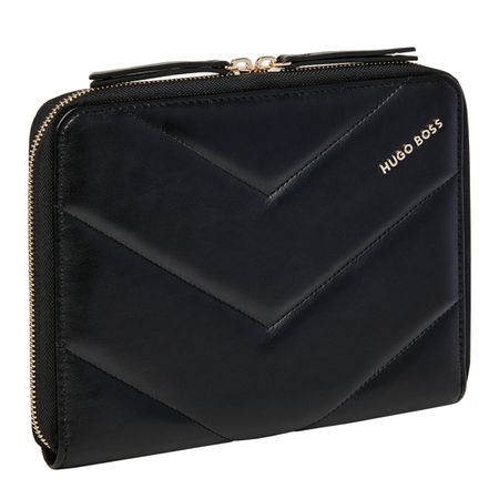 The feminine & sleek Triga folders are enhanced by luxe golden accents and mate vegan leather textures. They are signed by a beautiful golden HUGO BOSS logo plate, and their surface is quilted with a geometrical & graphical pattern, making it both modern & feminine. This A5 folder is available in 3 luxurious and warm tones : Black, Beige or Taupe. It willl be the perfect everyday companion, allowing to take notes on its paper pad, but also featuring a roamy interior to organise all your documents. The "Triga" line is perfect to mix & match in combinations that suit your taste, to create understated yet refined gift sets.