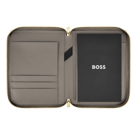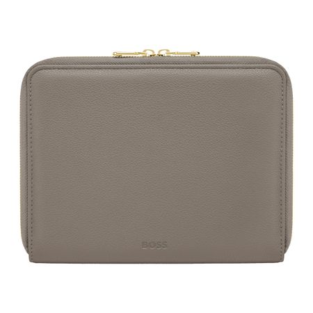 This signature lady folder in taupe highlights a big yet minimal three dimensional Double B logo as its defining feature. The raised logo adds a sense of quiet luxury while preserving a soft, balanced aesthetic. Made from beautifully grained matte PU, the material was carefully selected to elevate both look and feel. Soft gold accents run throughout the design, in harmony with the rest of the line, and are completed by newly developed Double B zipper pullers with a refined, jewelry-inspired character. The taupe tone brings softness and modern elegance, subtly warmed by gold details and the BOSS signature.
